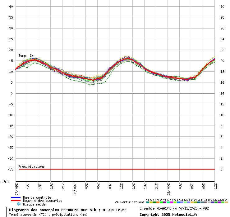 In queste mappe gli "spaghetti" generati dalla tecnica Ensemble per tutti i modelli matematici di cui si dispongono i dati, su località di vostra scelta. La tecnica Ensemble consiste nell'effettuare più corse (più quella di controllo) modificando di poco e opportunamente le condizioni iniziali inserite nei modelli stessi per verificare variazioni e affidabilità nell'evoluzione prevista. Laddove le soluzioni tendono ad "addensarsi" la prognosi sarà più probabile.