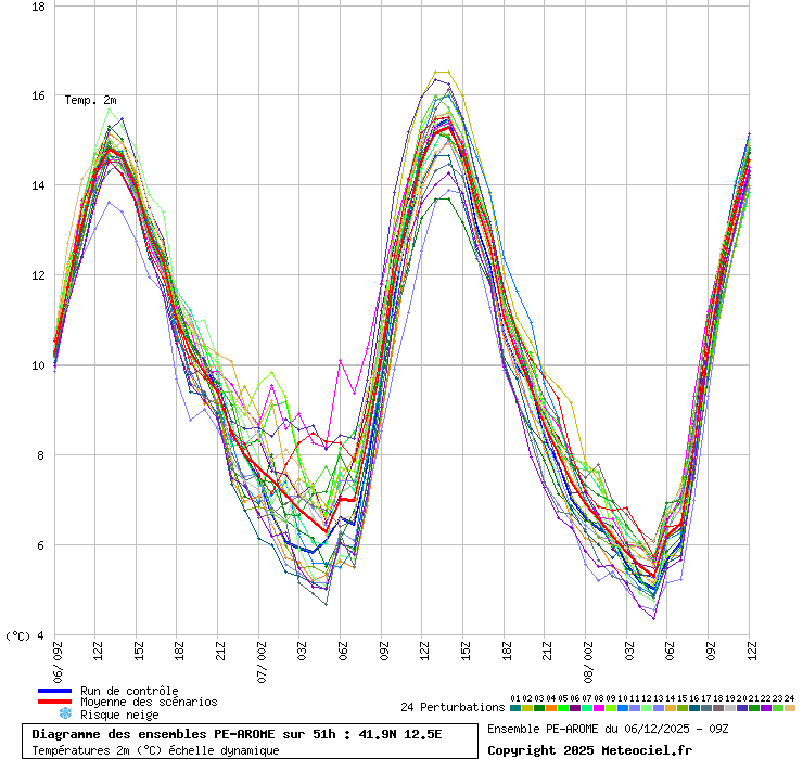 In queste mappe gli "spaghetti" generati dalla tecnica Ensemble per tutti i modelli matematici di cui si dispongono i dati, su località di vostra scelta. La tecnica Ensemble consiste nell'effettuare più corse (più quella di controllo) modificando di poco e opportunamente le condizioni iniziali inserite nei modelli stessi per verificare variazioni e affidabilità nell'evoluzione prevista. Laddove le soluzioni tendono ad "addensarsi" la prognosi sarà più probabile.