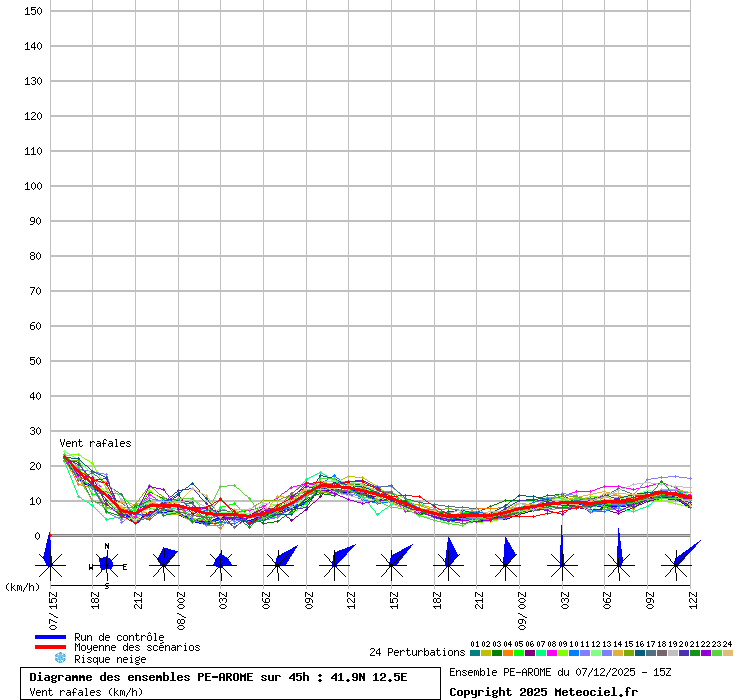 In queste mappe gli "spaghetti" generati dalla tecnica Ensemble per tutti i modelli matematici di cui si dispongono i dati, su località di vostra scelta. La tecnica Ensemble consiste nell'effettuare più corse (più quella di controllo) modificando di poco e opportunamente le condizioni iniziali inserite nei modelli stessi per verificare variazioni e affidabilità nell'evoluzione prevista. Laddove le soluzioni tendono ad "addensarsi" la prognosi sarà più probabile.
