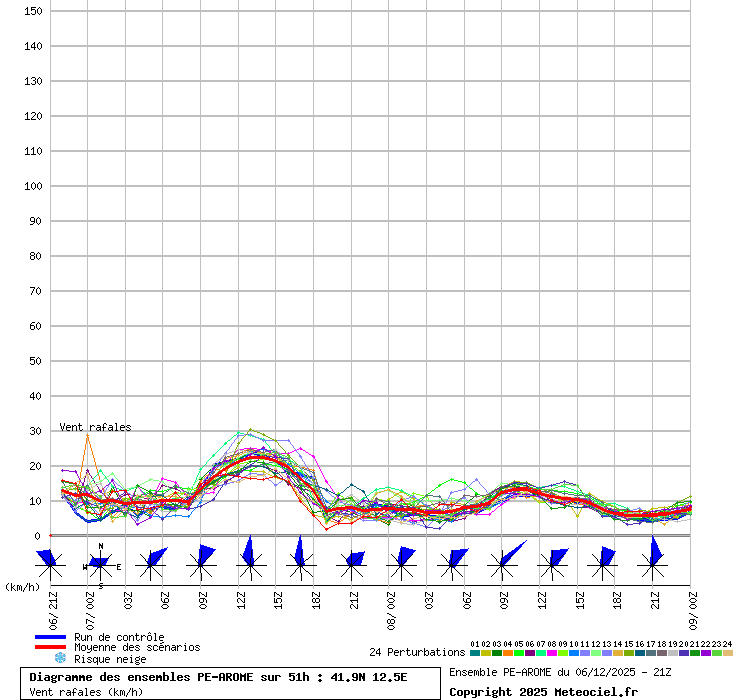 In queste mappe gli "spaghetti" generati dalla tecnica Ensemble per tutti i modelli matematici di cui si dispongono i dati, su località di vostra scelta. La tecnica Ensemble consiste nell'effettuare più corse (più quella di controllo) modificando di poco e opportunamente le condizioni iniziali inserite nei modelli stessi per verificare variazioni e affidabilità nell'evoluzione prevista. Laddove le soluzioni tendono ad "addensarsi" la prognosi sarà più probabile.
