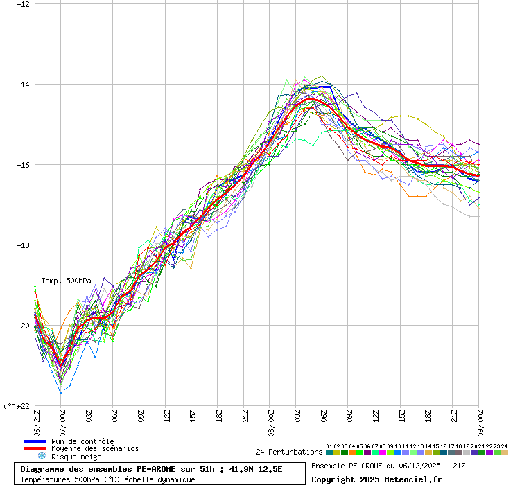 In queste mappe gli "spaghetti" generati dalla tecnica Ensemble per tutti i modelli matematici di cui si dispongono i dati, su località di vostra scelta. La tecnica Ensemble consiste nell'effettuare più corse (più quella di controllo) modificando di poco e opportunamente le condizioni iniziali inserite nei modelli stessi per verificare variazioni e affidabilità nell'evoluzione prevista. Laddove le soluzioni tendono ad "addensarsi" la prognosi sarà più probabile.