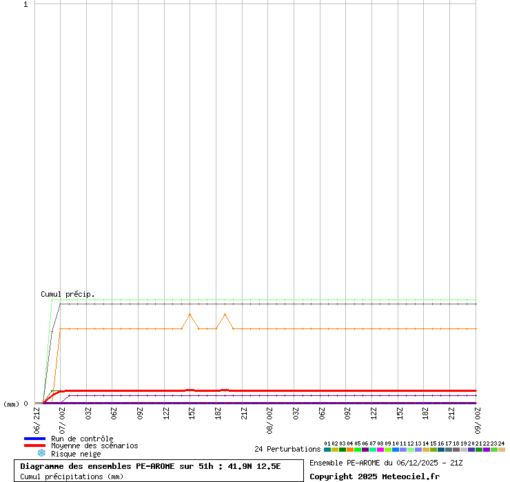 In queste mappe gli "spaghetti" generati dalla tecnica Ensemble per tutti i modelli matematici di cui si dispongono i dati, su località di vostra scelta. La tecnica Ensemble consiste nell'effettuare più corse (più quella di controllo) modificando di poco e opportunamente le condizioni iniziali inserite nei modelli stessi per verificare variazioni e affidabilità nell'evoluzione prevista. Laddove le soluzioni tendono ad "addensarsi" la prognosi sarà più probabile.