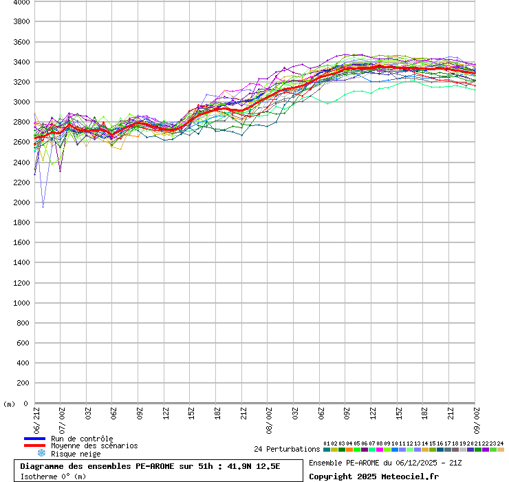 In queste mappe gli "spaghetti" generati dalla tecnica Ensemble per tutti i modelli matematici di cui si dispongono i dati, su località di vostra scelta. La tecnica Ensemble consiste nell'effettuare più corse (più quella di controllo) modificando di poco e opportunamente le condizioni iniziali inserite nei modelli stessi per verificare variazioni e affidabilità nell'evoluzione prevista. Laddove le soluzioni tendono ad "addensarsi" la prognosi sarà più probabile.