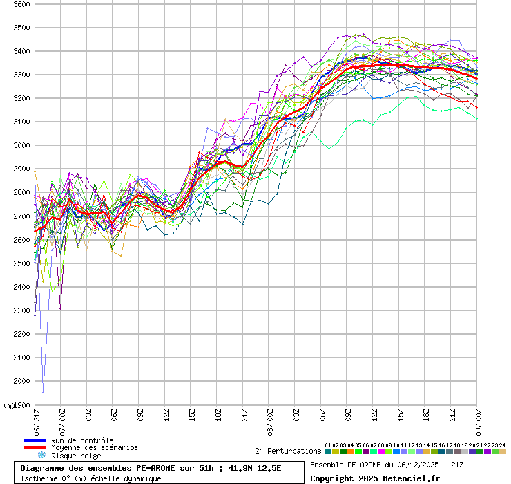 In queste mappe gli "spaghetti" generati dalla tecnica Ensemble per tutti i modelli matematici di cui si dispongono i dati, su località di vostra scelta. La tecnica Ensemble consiste nell'effettuare più corse (più quella di controllo) modificando di poco e opportunamente le condizioni iniziali inserite nei modelli stessi per verificare variazioni e affidabilità nell'evoluzione prevista. Laddove le soluzioni tendono ad "addensarsi" la prognosi sarà più probabile.