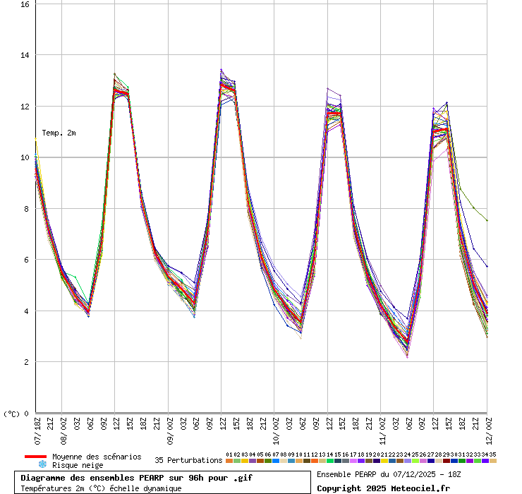 In queste mappe gli "spaghetti" generati dalla tecnica Ensemble per tutti i modelli matematici di cui si dispongono i dati, su località di vostra scelta. La tecnica Ensemble consiste nell'effettuare più corse (più quella di controllo) modificando di poco e opportunamente le condizioni iniziali inserite nei modelli stessi per verificare variazioni e affidabilità nell'evoluzione prevista. Laddove le soluzioni tendono ad "addensarsi" la prognosi sarà più probabile.