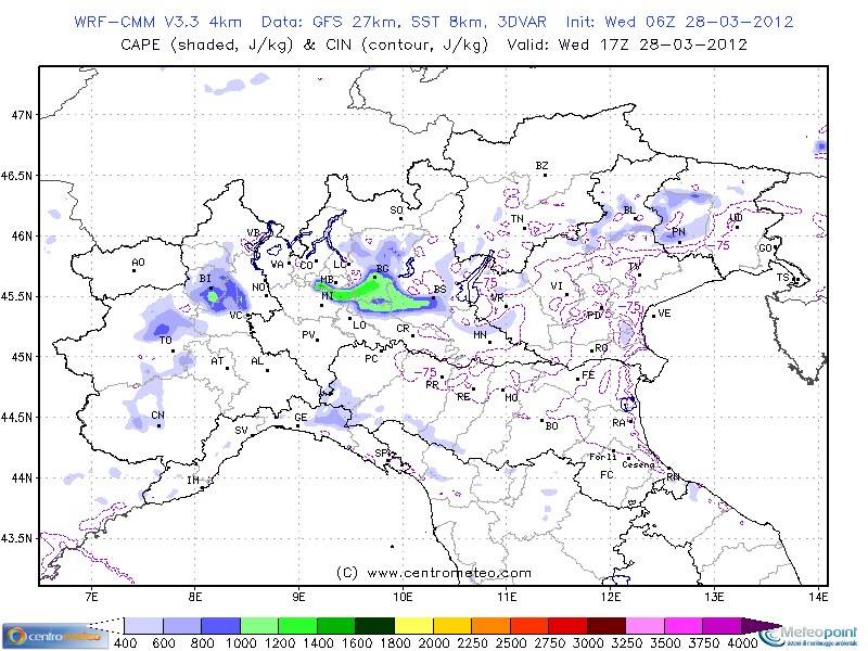 Cape per il Nord Italia del 28 marzo 2012 alle ore 17.Possibilità di debole cumulogenesi sulla pedemontana bergamasca e nel biellese |