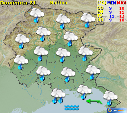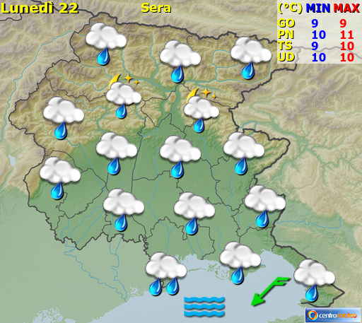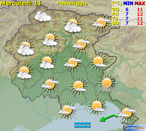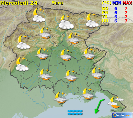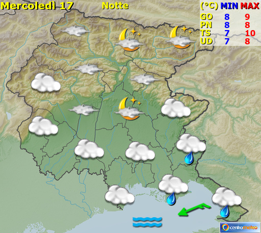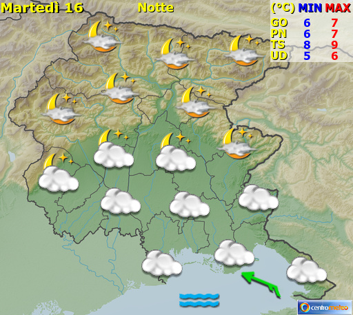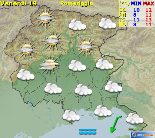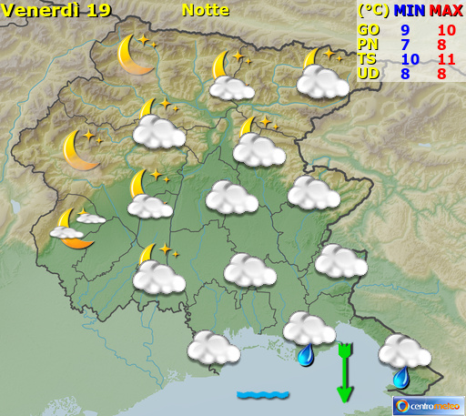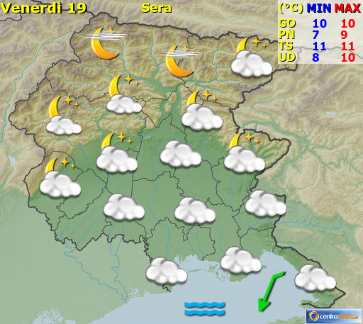 Le previsioni meteo per la regione Friuli Venezia Giulia nei prossimi giorni. Mappe con il riassunto mattina, pomeriggio, sera, notte.