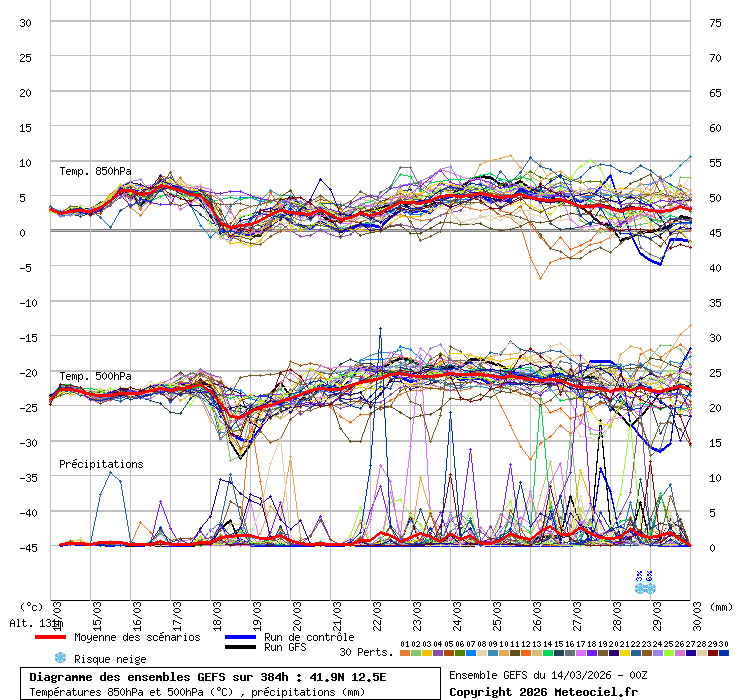 In queste mappe gli "spaghetti" generati dalla tecnica Ensemble per tutti i modelli matematici di cui si dispongono i dati, su località di vostra scelta. La tecnica Ensemble consiste nell'effettuare più corse (più quella di controllo) modificando di poco e opportunamente le condizioni iniziali inserite nei modelli stessi per verificare variazioni e affidabilità nell'evoluzione prevista. Laddove le soluzioni tendono ad "addensarsi" la prognosi sarà più probabile.