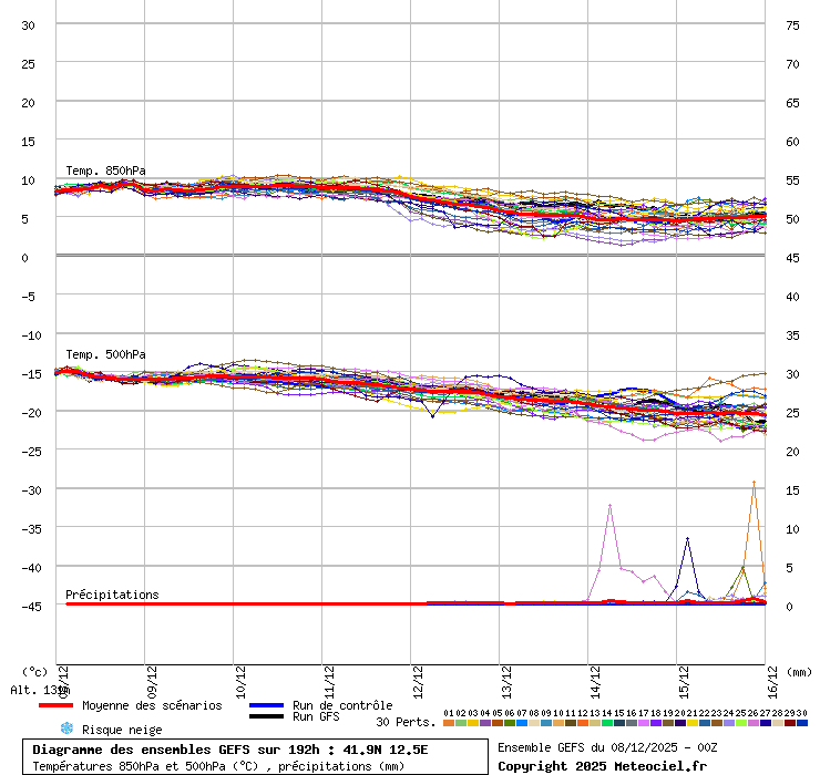 In queste mappe gli "spaghetti" generati dalla tecnica Ensemble per tutti i modelli matematici di cui si dispongono i dati, su località di vostra scelta. La tecnica Ensemble consiste nell'effettuare più corse (più quella di controllo) modificando di poco e opportunamente le condizioni iniziali inserite nei modelli stessi per verificare variazioni e affidabilità nell'evoluzione prevista. Laddove le soluzioni tendono ad "addensarsi" la prognosi sarà più probabile.
