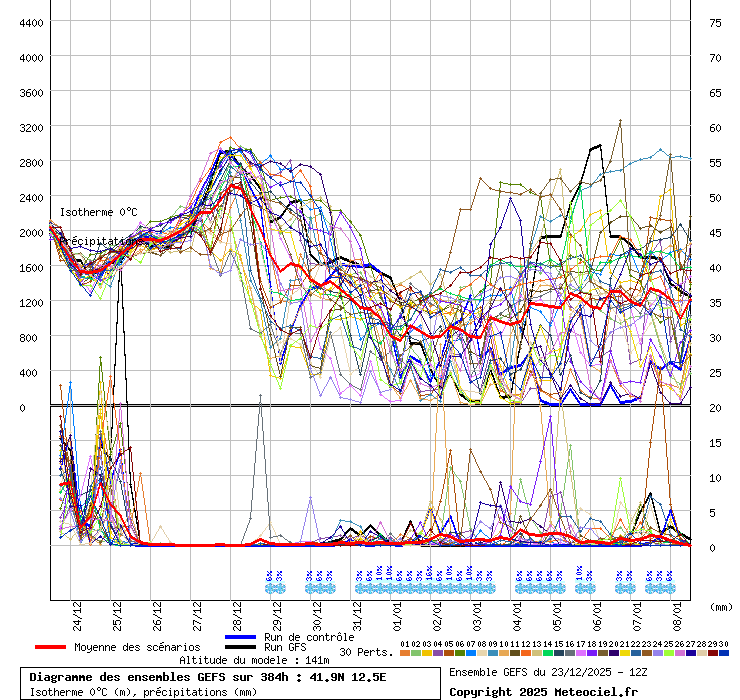 In queste mappe gli "spaghetti" generati dalla tecnica Ensemble per tutti i modelli matematici di cui si dispongono i dati, su località di vostra scelta. La tecnica Ensemble consiste nell'effettuare più corse (più quella di controllo) modificando di poco e opportunamente le condizioni iniziali inserite nei modelli stessi per verificare variazioni e affidabilità nell'evoluzione prevista. Laddove le soluzioni tendono ad "addensarsi" la prognosi sarà più probabile.