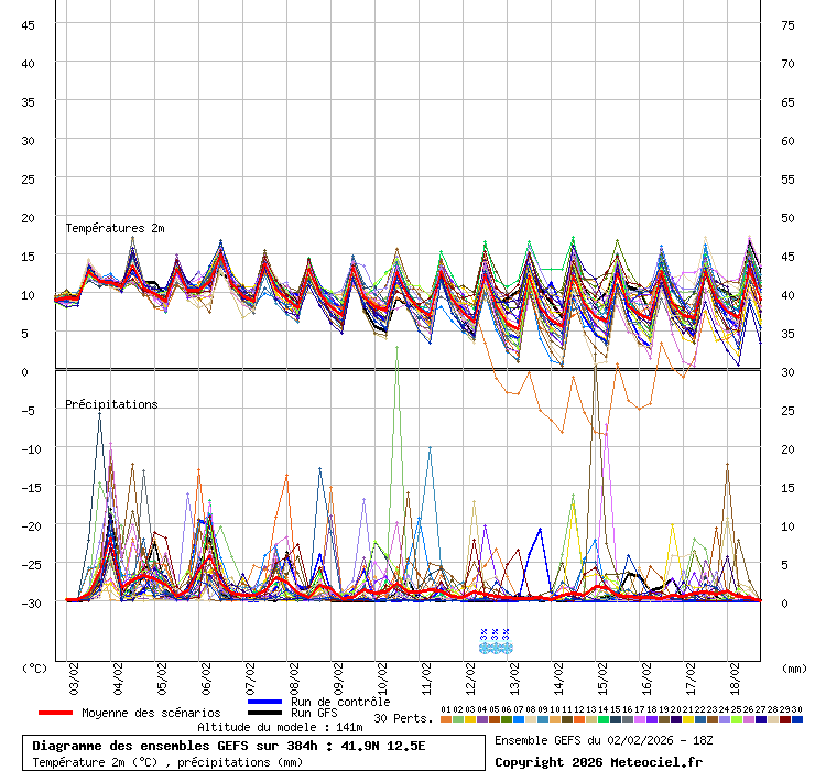 In queste mappe gli "spaghetti" generati dalla tecnica Ensemble per tutti i modelli matematici di cui si dispongono i dati, su località di vostra scelta. La tecnica Ensemble consiste nell'effettuare più corse (più quella di controllo) modificando di poco e opportunamente le condizioni iniziali inserite nei modelli stessi per verificare variazioni e affidabilità nell'evoluzione prevista. Laddove le soluzioni tendono ad "addensarsi" la prognosi sarà più probabile.