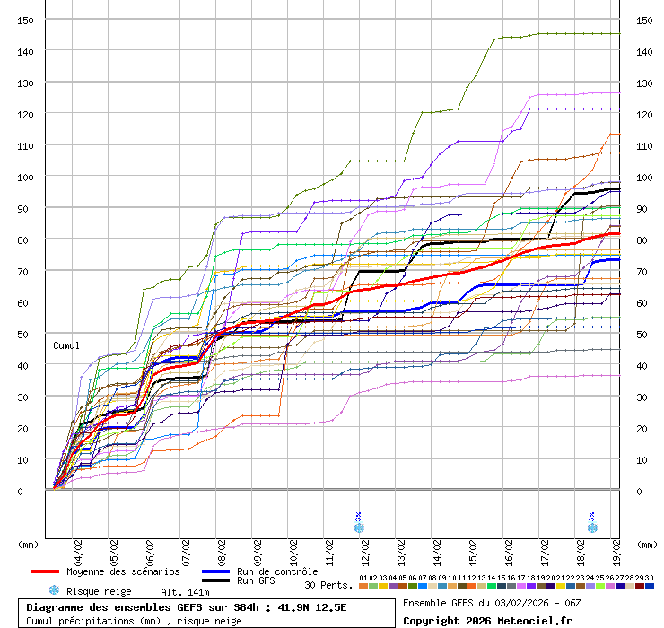 In queste mappe gli "spaghetti" generati dalla tecnica Ensemble per tutti i modelli matematici di cui si dispongono i dati, su località di vostra scelta. La tecnica Ensemble consiste nell'effettuare più corse (più quella di controllo) modificando di poco e opportunamente le condizioni iniziali inserite nei modelli stessi per verificare variazioni e affidabilità nell'evoluzione prevista. Laddove le soluzioni tendono ad "addensarsi" la prognosi sarà più probabile.