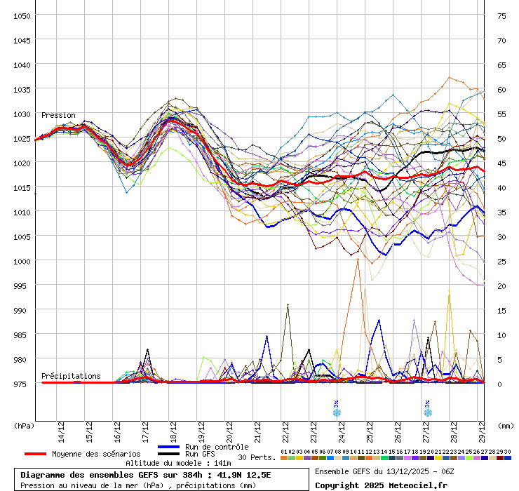In queste mappe gli "spaghetti" generati dalla tecnica Ensemble per tutti i modelli matematici di cui si dispongono i dati, su località di vostra scelta. La tecnica Ensemble consiste nell'effettuare più corse (più quella di controllo) modificando di poco e opportunamente le condizioni iniziali inserite nei modelli stessi per verificare variazioni e affidabilità nell'evoluzione prevista. Laddove le soluzioni tendono ad "addensarsi" la prognosi sarà più probabile.