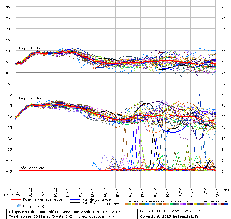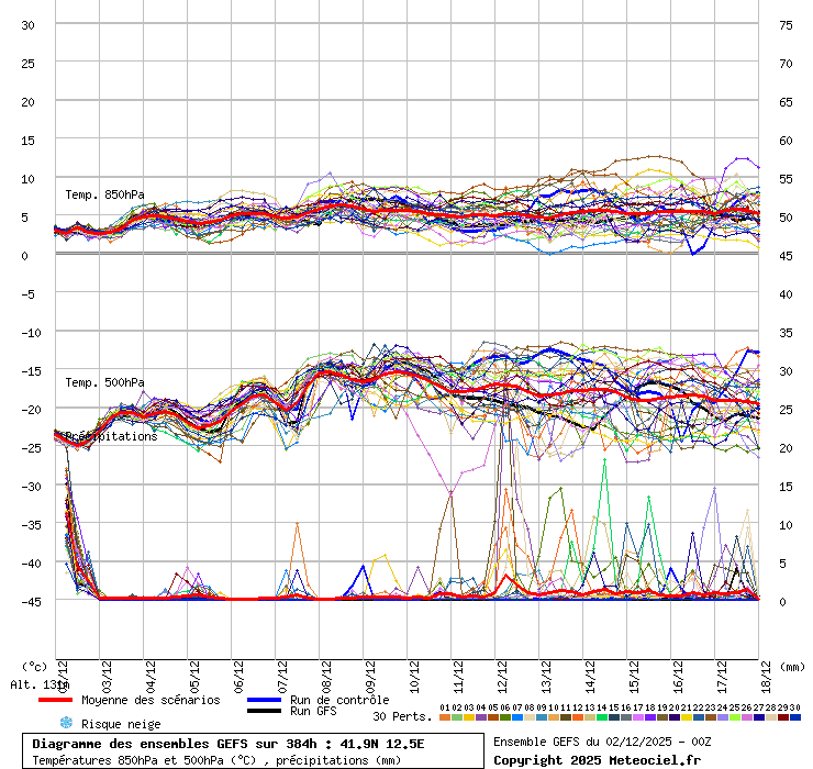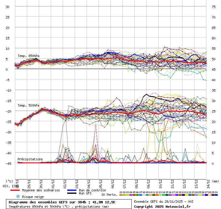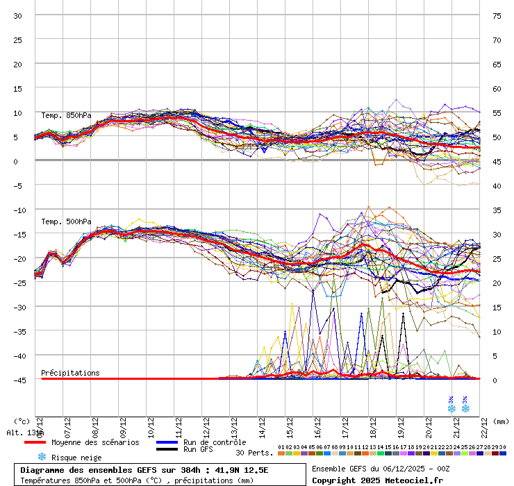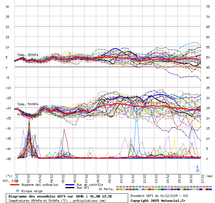 In queste mappe gli "spaghetti" generati dalla tecnica Ensemble per tutti i modelli matematici di cui si dispongono i dati, su località di vostra scelta. La tecnica Ensemble consiste nell'effettuare più corse (più quella di controllo) modificando di poco e opportunamente le condizioni iniziali inserite nei modelli stessi per verificare variazioni e affidabilità nell'evoluzione prevista. Laddove le soluzioni tendono ad "addensarsi" la prognosi sarà più probabile.