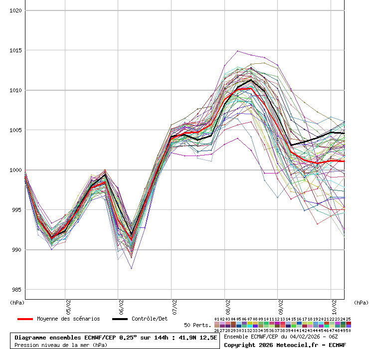 In queste mappe gli "spaghetti" generati dalla tecnica Ensemble per tutti i modelli matematici di cui si dispongono i dati, su località di vostra scelta. La tecnica Ensemble consiste nell'effettuare più corse (più quella di controllo) modificando di poco e opportunamente le condizioni iniziali inserite nei modelli stessi per verificare variazioni e affidabilità nell'evoluzione prevista. Laddove le soluzioni tendono ad "addensarsi" la prognosi sarà più probabile.