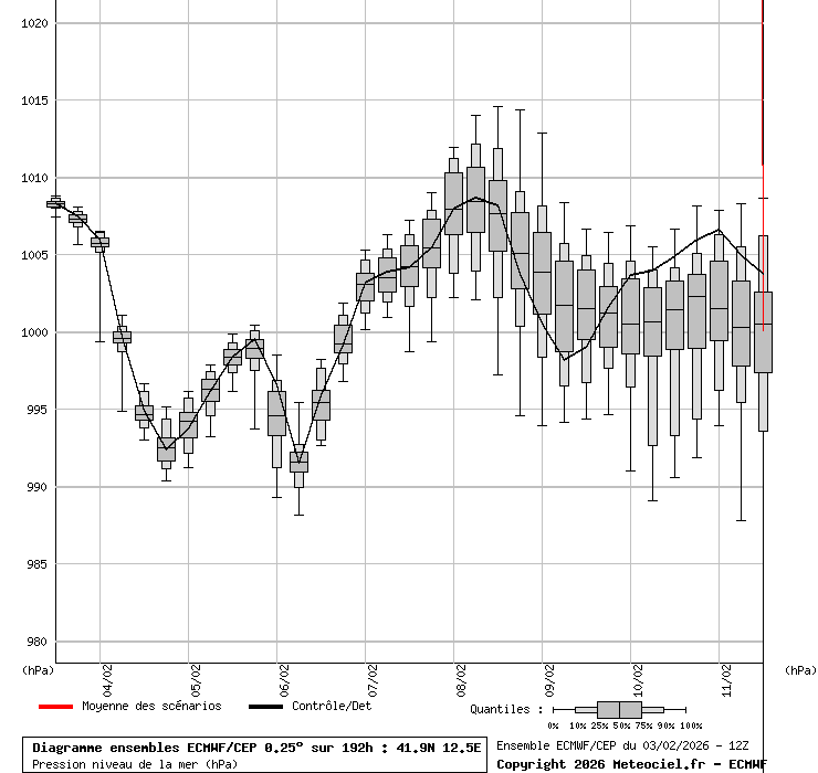In queste mappe gli "spaghetti" generati dalla tecnica Ensemble per tutti i modelli matematici di cui si dispongono i dati, su località di vostra scelta. La tecnica Ensemble consiste nell'effettuare più corse (più quella di controllo) modificando di poco e opportunamente le condizioni iniziali inserite nei modelli stessi per verificare variazioni e affidabilità nell'evoluzione prevista. Laddove le soluzioni tendono ad "addensarsi" la prognosi sarà più probabile.