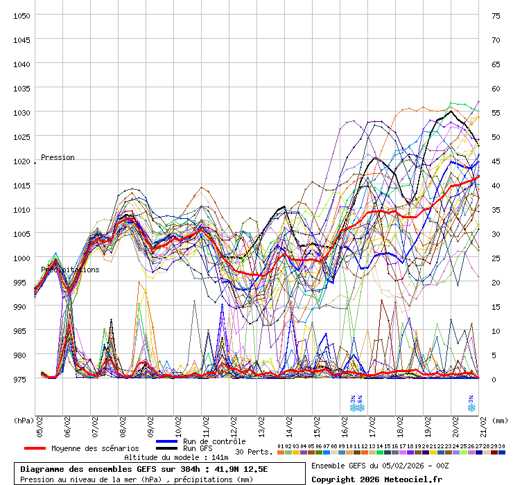 In queste mappe gli "spaghetti" generati dalla tecnica Ensemble per tutti i modelli matematici di cui si dispongono i dati, su località di vostra scelta. La tecnica Ensemble consiste nell'effettuare più corse (più quella di controllo) modificando di poco e opportunamente le condizioni iniziali inserite nei modelli stessi per verificare variazioni e affidabilità nell'evoluzione prevista. Laddove le soluzioni tendono ad "addensarsi" la prognosi sarà più probabile.