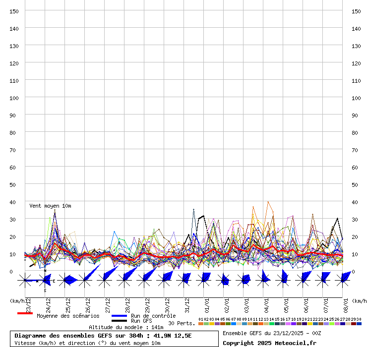 In queste mappe gli "spaghetti" generati dalla tecnica Ensemble per tutti i modelli matematici di cui si dispongono i dati, su località di vostra scelta. La tecnica Ensemble consiste nell'effettuare più corse (più quella di controllo) modificando di poco e opportunamente le condizioni iniziali inserite nei modelli stessi per verificare variazioni e affidabilità nell'evoluzione prevista. Laddove le soluzioni tendono ad "addensarsi" la prognosi sarà più probabile.