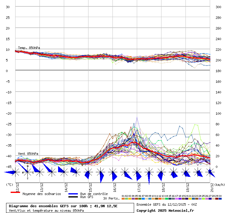 In queste mappe gli "spaghetti" generati dalla tecnica Ensemble per tutti i modelli matematici di cui si dispongono i dati, su località di vostra scelta. La tecnica Ensemble consiste nell'effettuare più corse (più quella di controllo) modificando di poco e opportunamente le condizioni iniziali inserite nei modelli stessi per verificare variazioni e affidabilità nell'evoluzione prevista. Laddove le soluzioni tendono ad "addensarsi" la prognosi sarà più probabile.
