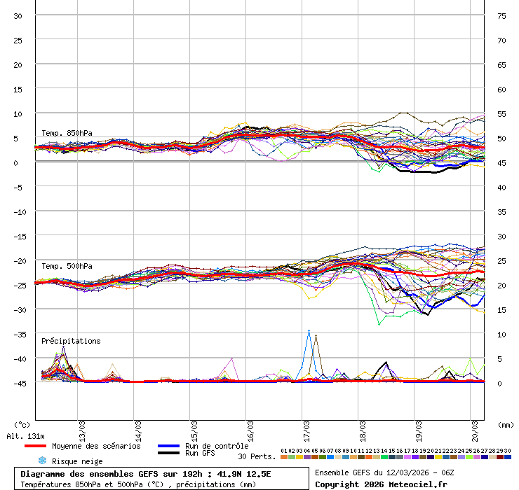 In queste mappe gli "spaghetti" generati dalla tecnica Ensemble per tutti i modelli matematici di cui si dispongono i dati, su località di vostra scelta. La tecnica Ensemble consiste nell'effettuare più corse (più quella di controllo) modificando di poco e opportunamente le condizioni iniziali inserite nei modelli stessi per verificare variazioni e affidabilità nell'evoluzione prevista. Laddove le soluzioni tendono ad "addensarsi" la prognosi sarà più probabile.