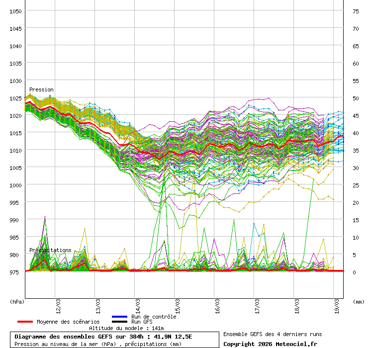 In queste mappe gli "spaghetti" generati dalla tecnica Ensemble per tutti i modelli matematici di cui si dispongono i dati, su località di vostra scelta. La tecnica Ensemble consiste nell'effettuare più corse (più quella di controllo) modificando di poco e opportunamente le condizioni iniziali inserite nei modelli stessi per verificare variazioni e affidabilità nell'evoluzione prevista. Laddove le soluzioni tendono ad "addensarsi" la prognosi sarà più probabile.