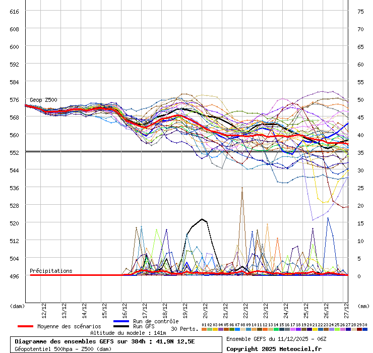 In queste mappe gli "spaghetti" generati dalla tecnica Ensemble per tutti i modelli matematici di cui si dispongono i dati, su località di vostra scelta. La tecnica Ensemble consiste nell'effettuare più corse (più quella di controllo) modificando di poco e opportunamente le condizioni iniziali inserite nei modelli stessi per verificare variazioni e affidabilità nell'evoluzione prevista. Laddove le soluzioni tendono ad "addensarsi" la prognosi sarà più probabile.