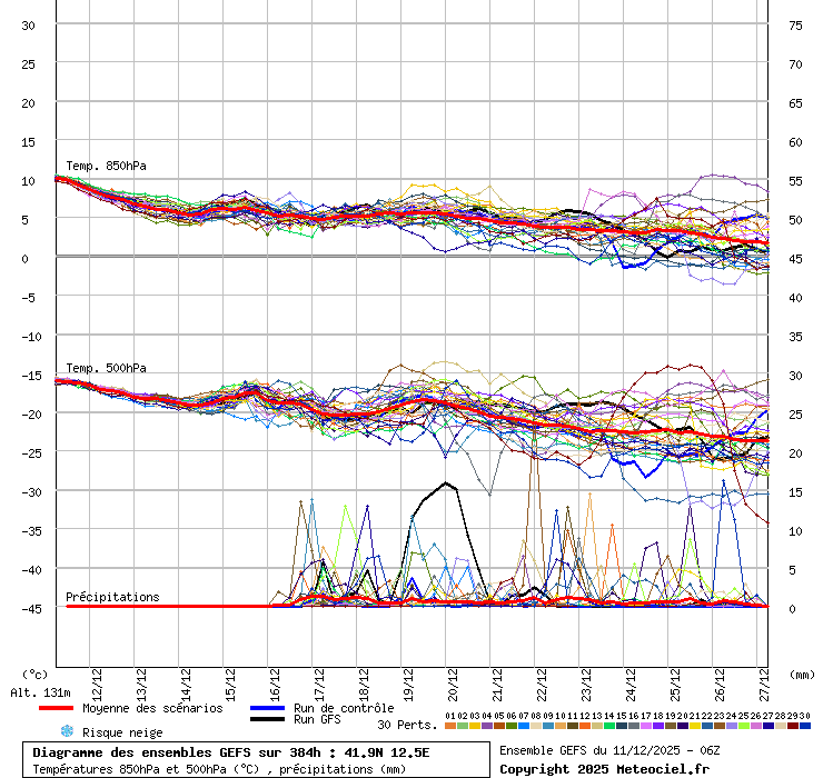 In queste mappe gli "spaghetti" generati dalla tecnica Ensemble per tutti i modelli matematici di cui si dispongono i dati, su località di vostra scelta. La tecnica Ensemble consiste nell'effettuare più corse (più quella di controllo) modificando di poco e opportunamente le condizioni iniziali inserite nei modelli stessi per verificare variazioni e affidabilità nell'evoluzione prevista. Laddove le soluzioni tendono ad "addensarsi" la prognosi sarà più probabile.