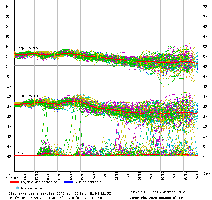 In queste mappe gli "spaghetti" generati dalla tecnica Ensemble per tutti i modelli matematici di cui si dispongono i dati, su località di vostra scelta. La tecnica Ensemble consiste nell'effettuare più corse (più quella di controllo) modificando di poco e opportunamente le condizioni iniziali inserite nei modelli stessi per verificare variazioni e affidabilità nell'evoluzione prevista. Laddove le soluzioni tendono ad "addensarsi" la prognosi sarà più probabile.