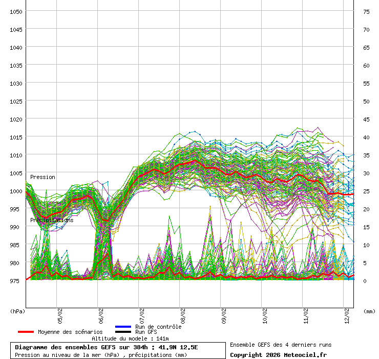 In queste mappe gli "spaghetti" generati dalla tecnica Ensemble per tutti i modelli matematici di cui si dispongono i dati, su località di vostra scelta. La tecnica Ensemble consiste nell'effettuare più corse (più quella di controllo) modificando di poco e opportunamente le condizioni iniziali inserite nei modelli stessi per verificare variazioni e affidabilità nell'evoluzione prevista. Laddove le soluzioni tendono ad "addensarsi" la prognosi sarà più probabile.