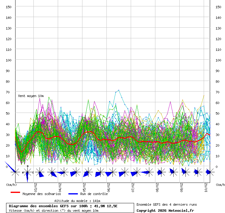 In queste mappe gli "spaghetti" generati dalla tecnica Ensemble per tutti i modelli matematici di cui si dispongono i dati, su località di vostra scelta. La tecnica Ensemble consiste nell'effettuare più corse (più quella di controllo) modificando di poco e opportunamente le condizioni iniziali inserite nei modelli stessi per verificare variazioni e affidabilità nell'evoluzione prevista. Laddove le soluzioni tendono ad "addensarsi" la prognosi sarà più probabile.