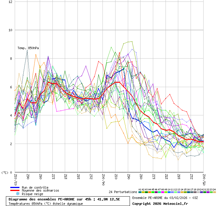 In queste mappe gli "spaghetti" generati dalla tecnica Ensemble per tutti i modelli matematici di cui si dispongono i dati, su località di vostra scelta. La tecnica Ensemble consiste nell'effettuare più corse (più quella di controllo) modificando di poco e opportunamente le condizioni iniziali inserite nei modelli stessi per verificare variazioni e affidabilità nell'evoluzione prevista. Laddove le soluzioni tendono ad "addensarsi" la prognosi sarà più probabile.