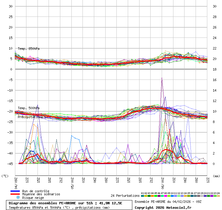 In queste mappe gli "spaghetti" generati dalla tecnica Ensemble per tutti i modelli matematici di cui si dispongono i dati, su località di vostra scelta. La tecnica Ensemble consiste nell'effettuare più corse (più quella di controllo) modificando di poco e opportunamente le condizioni iniziali inserite nei modelli stessi per verificare variazioni e affidabilità nell'evoluzione prevista. Laddove le soluzioni tendono ad "addensarsi" la prognosi sarà più probabile.